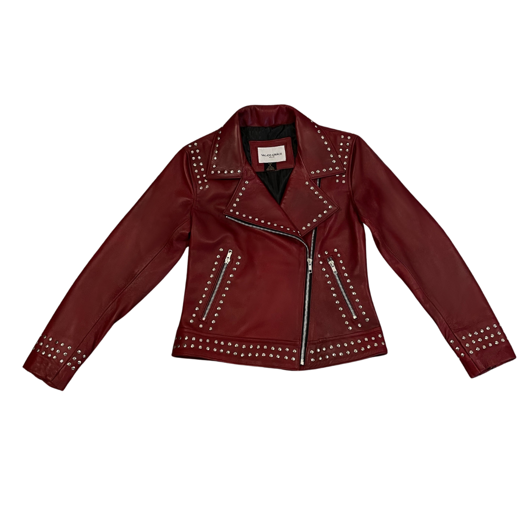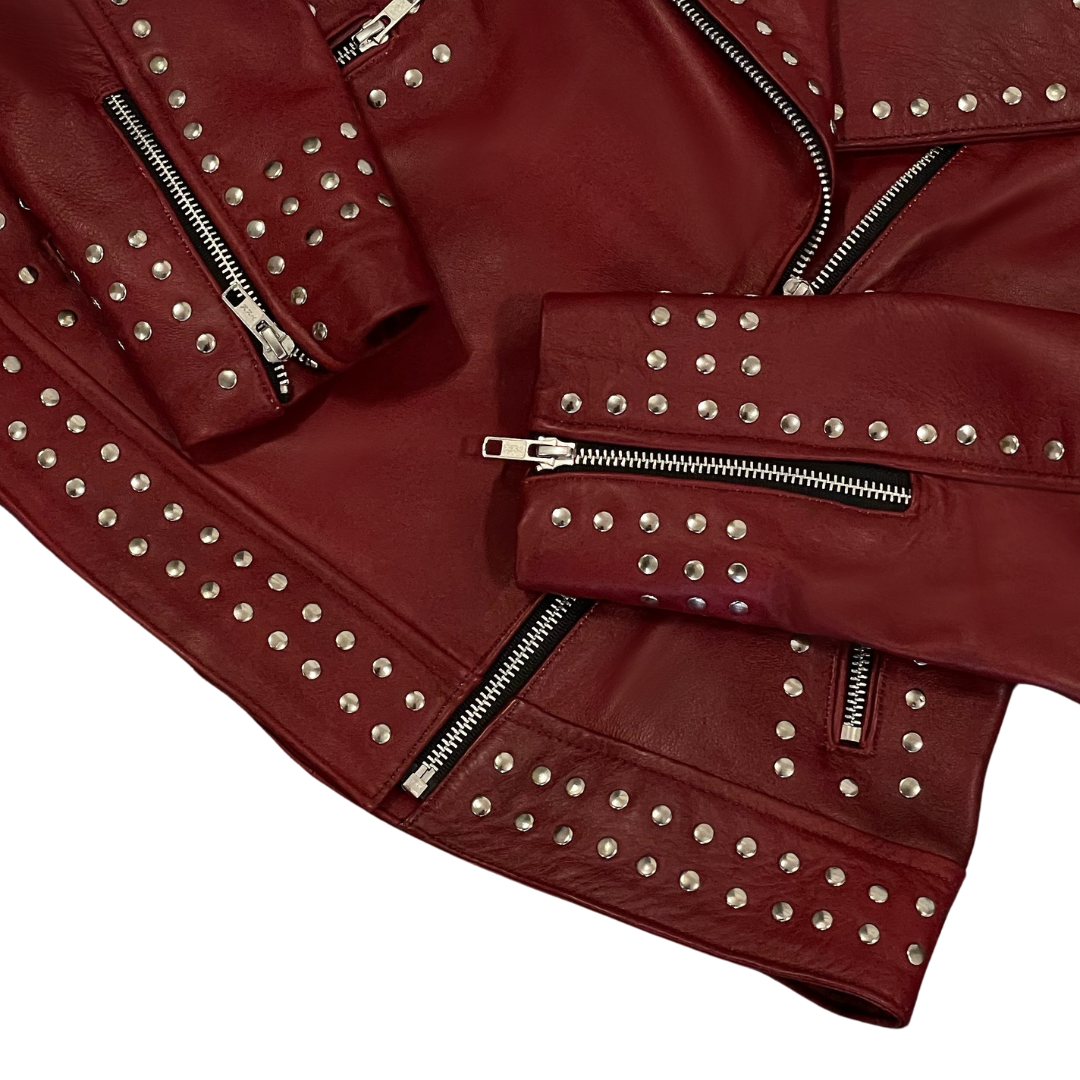 Chamarra en piel ovina genuina color rojo quemado con estoperoles