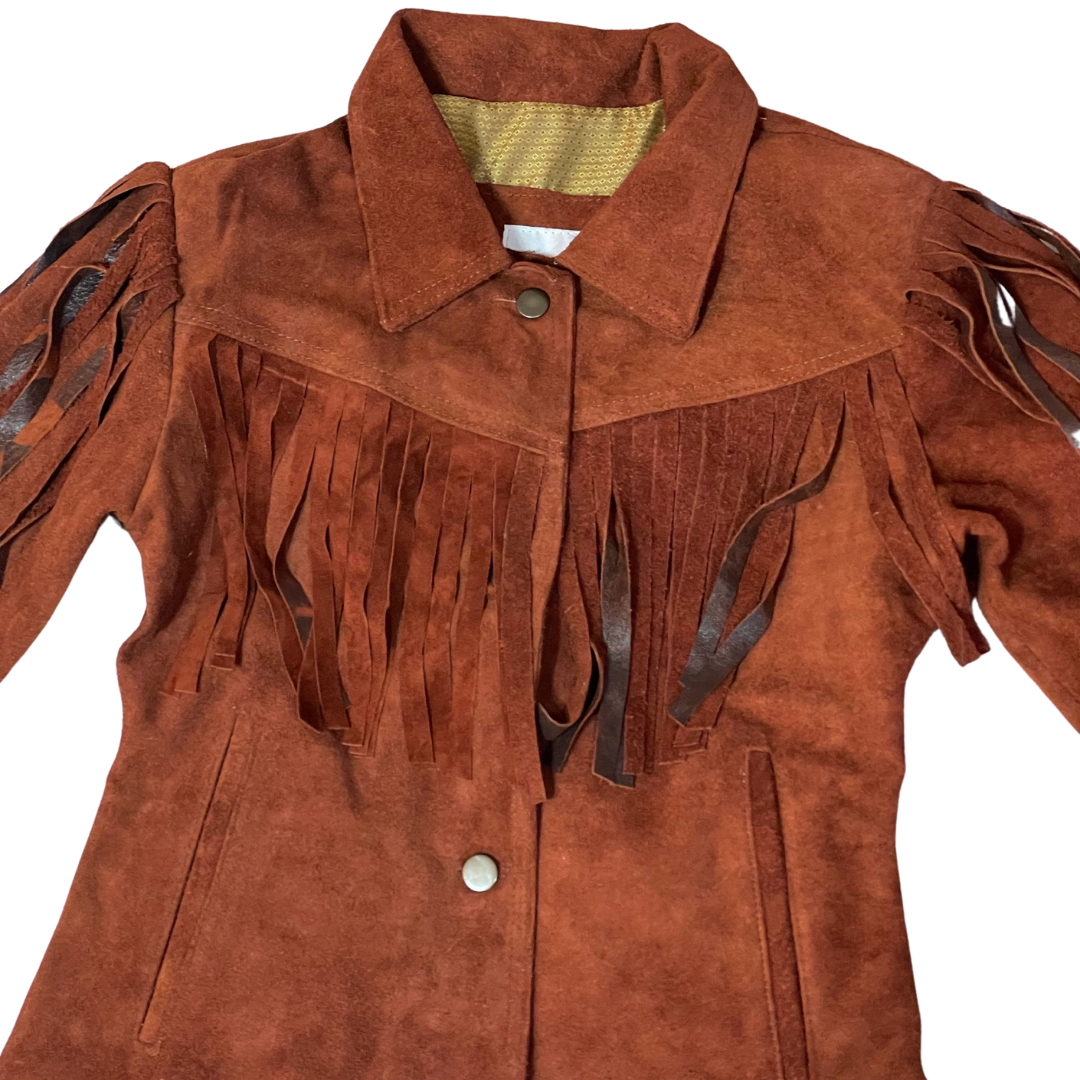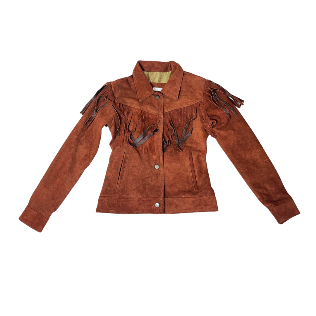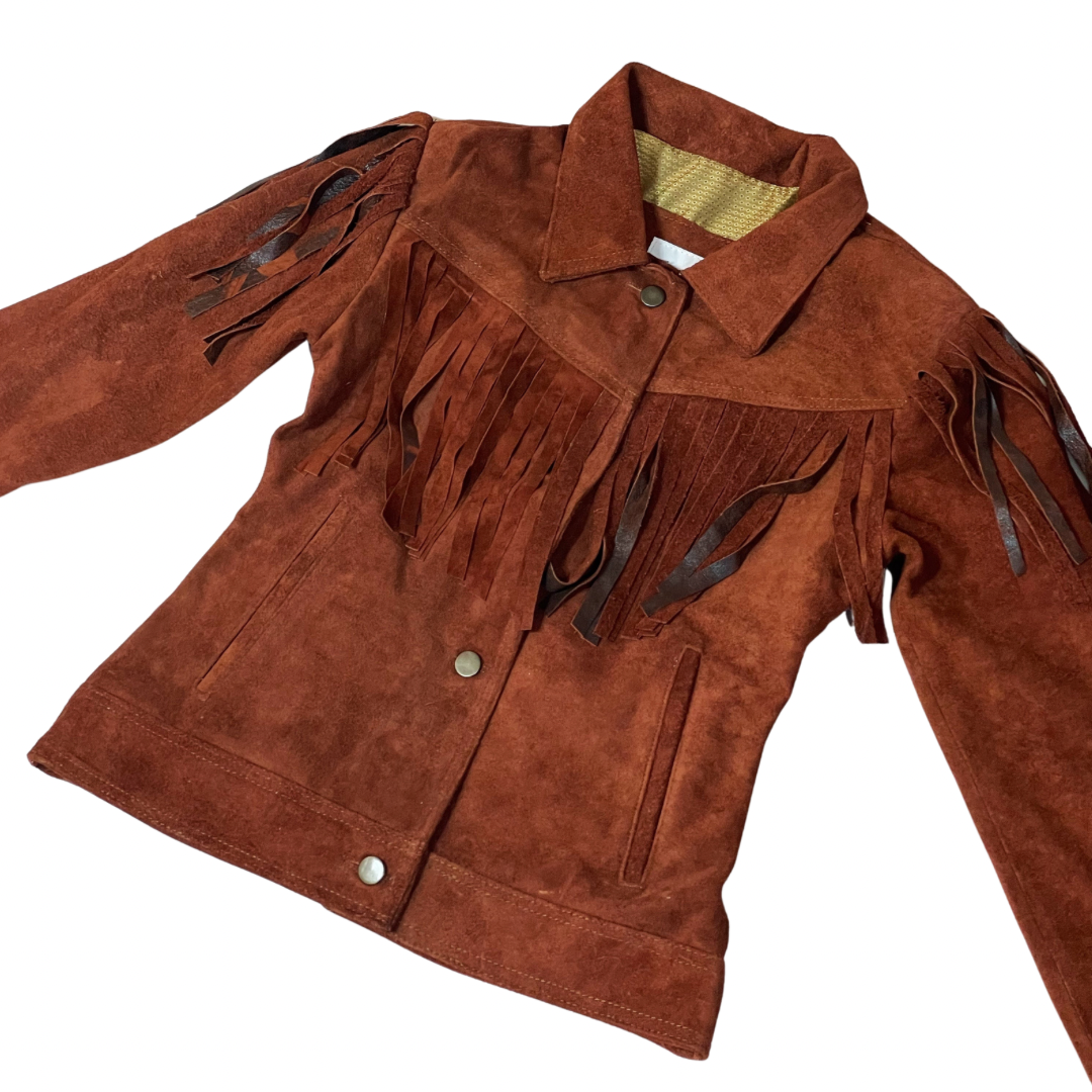 Chamarra hecha en piel gamuza ovina color chedron con tiras de la misma piel en la parte frontal y la parte de la espalda